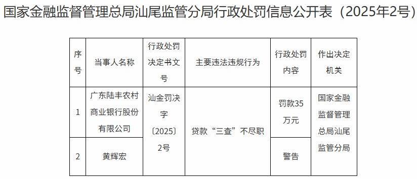 【大河财立方消息】11月13日,国家金融监督管理总局汕尾监管分局披露的行政处罚信息公开表显示,因贷款“三查”不尽职诚利和 ,广东陆丰农村商业银行股份有限公司被罚35万元。